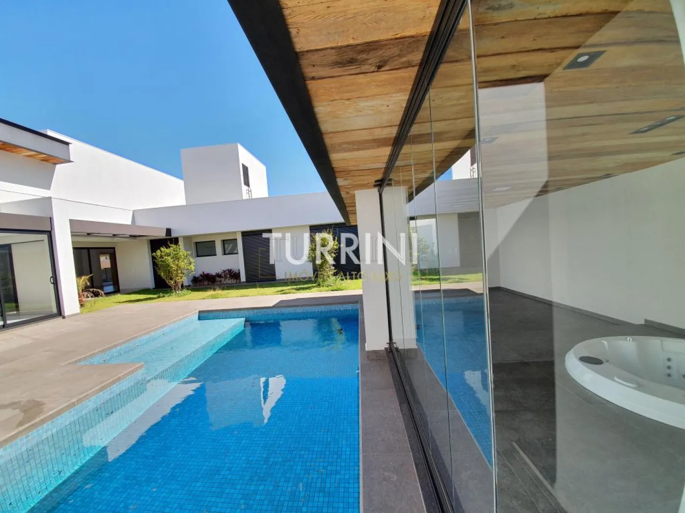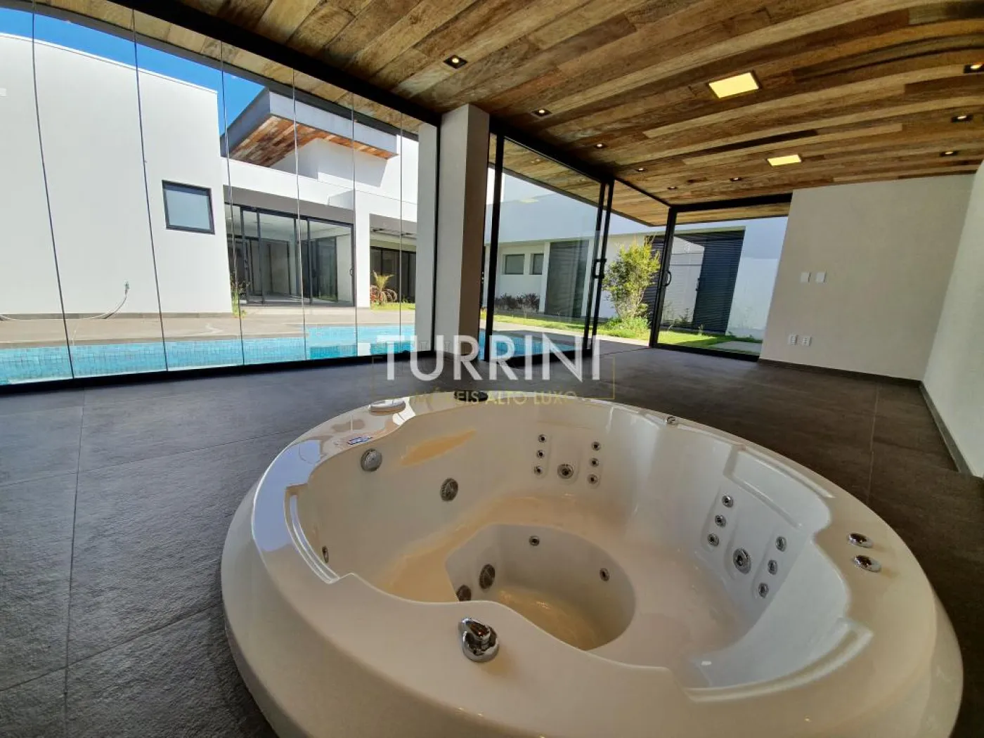 Piscina com pastilhas, borda infinita, iluminação em LED e sistema de aquecimento solar. Próximo há um espaço para descanso ou academia, e um Spa da Marca ?Riolax? que possui vista para a piscina.