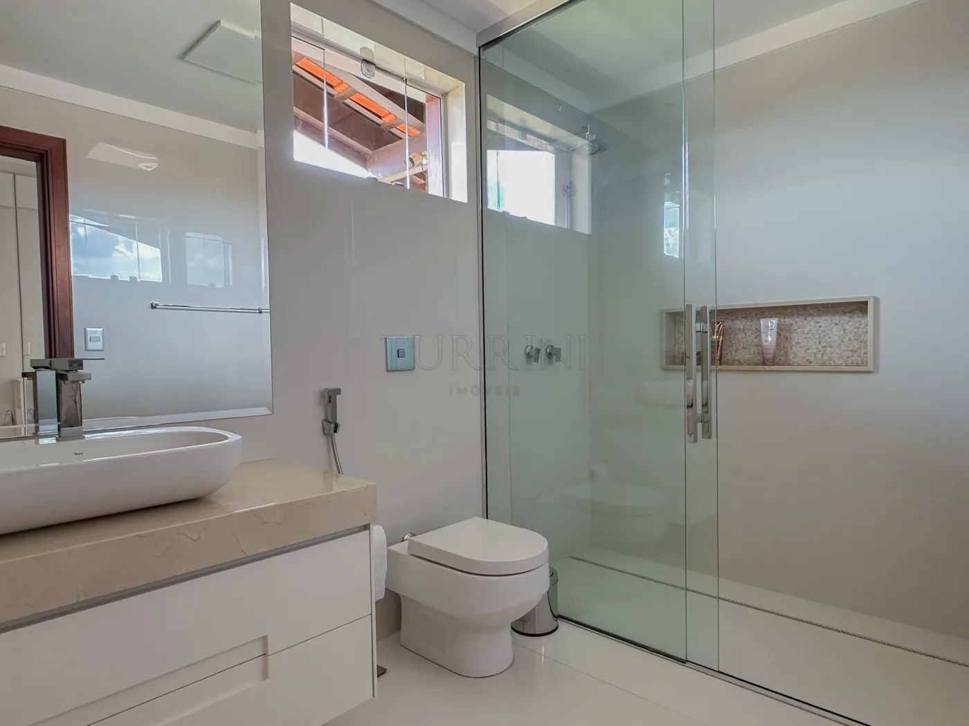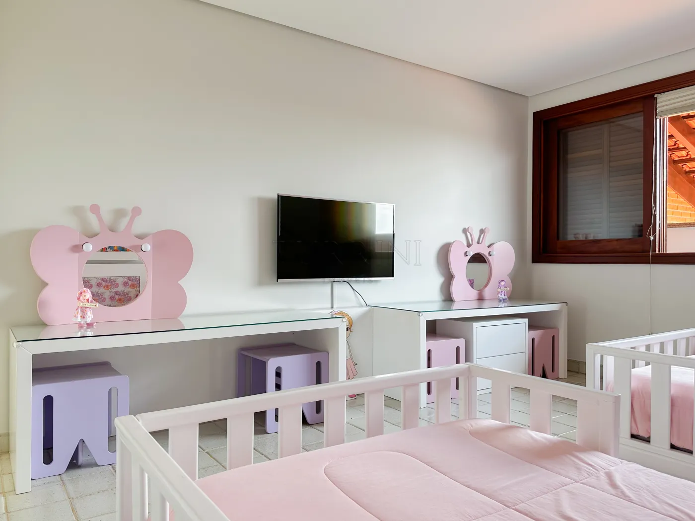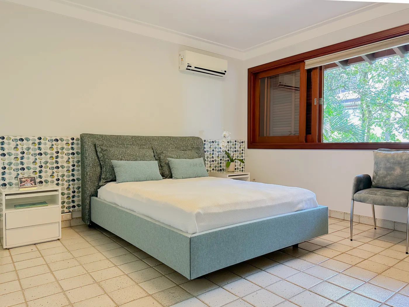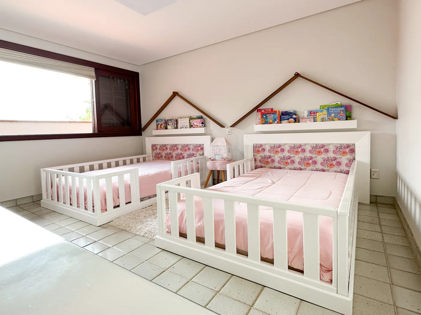 Na frente da casa estão a suíte do casal, localizada ao centro, e duas amplas suítes, uma em cada lateral.
