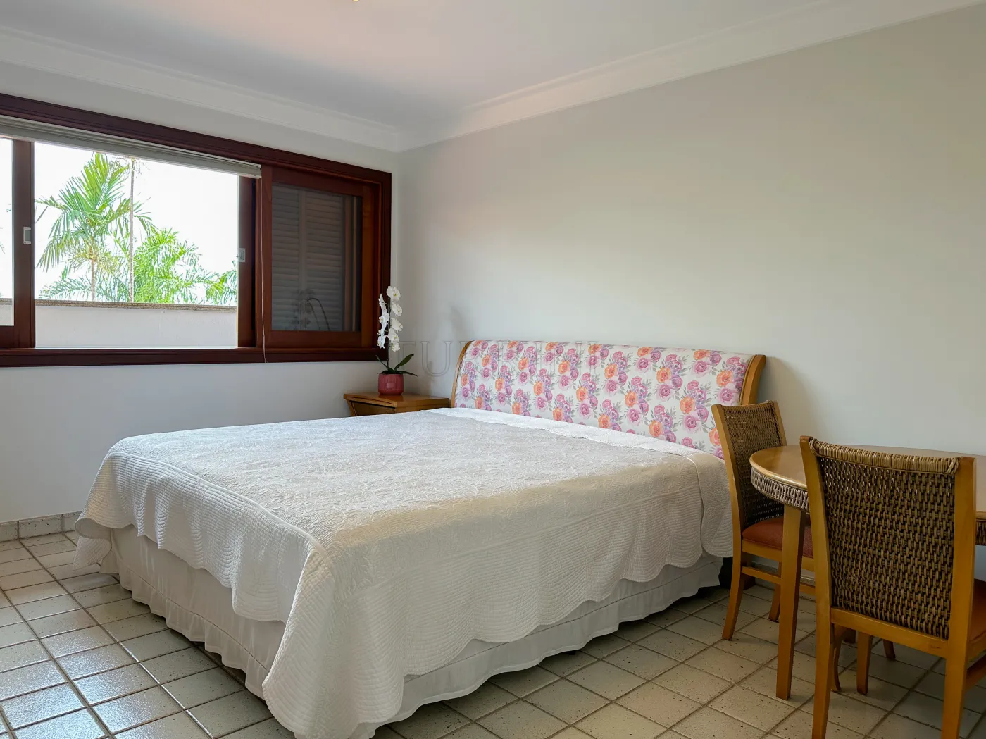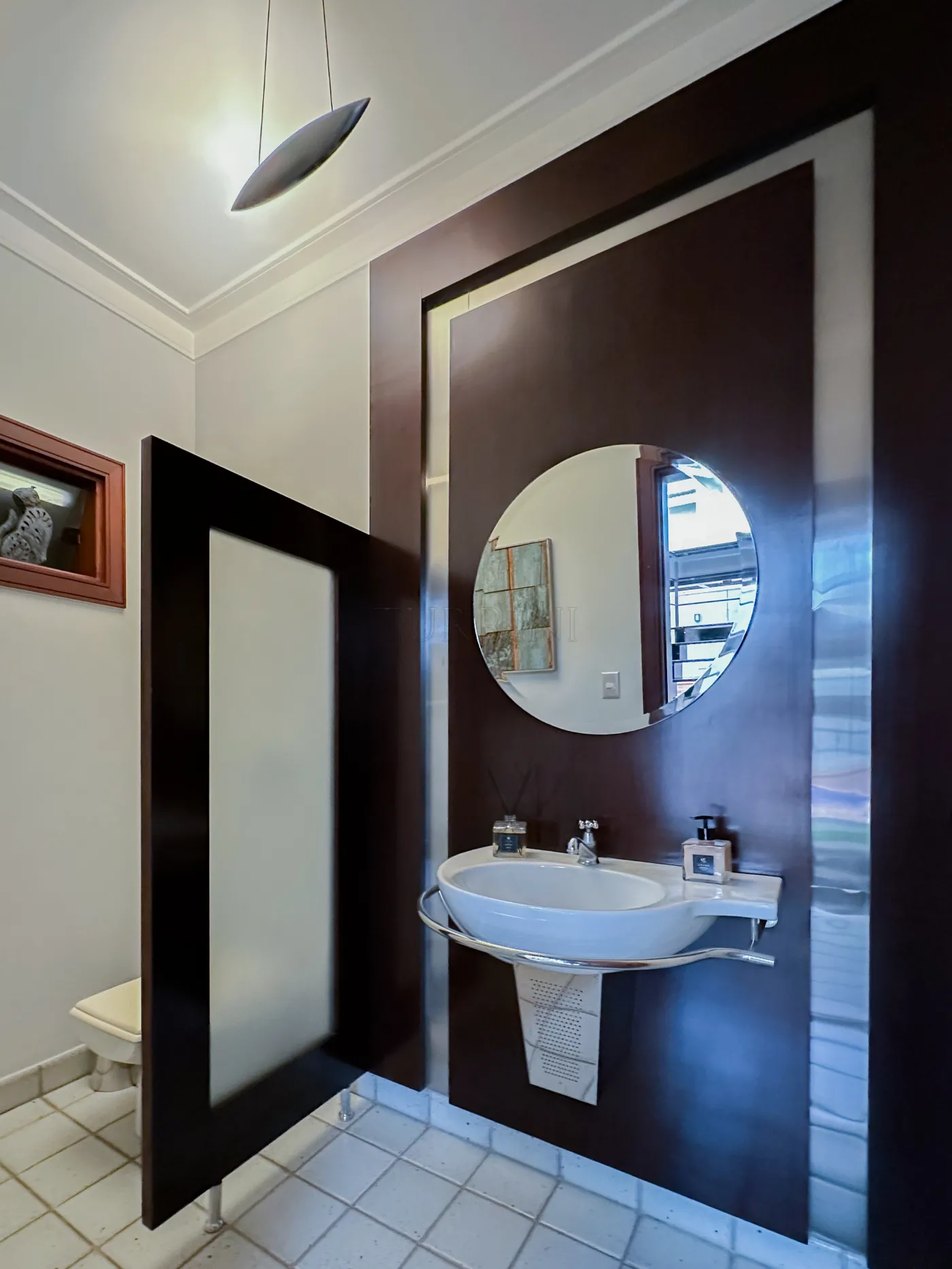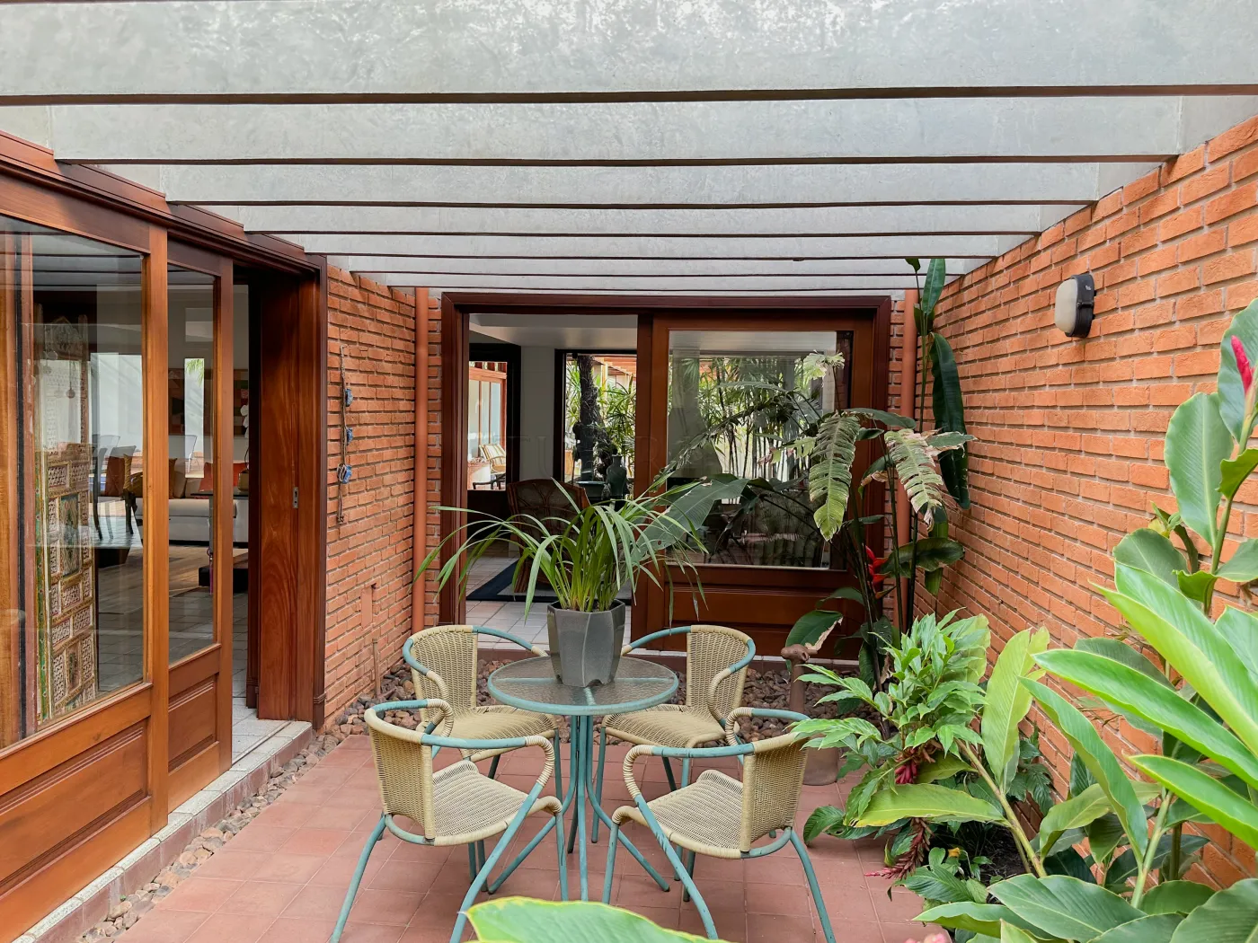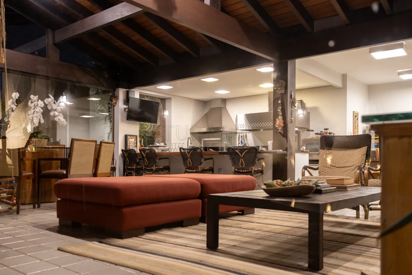 Na lateral da casa estão duas suítes para hóspedes, atendidas por uma copa, com acesso à sala de TV.