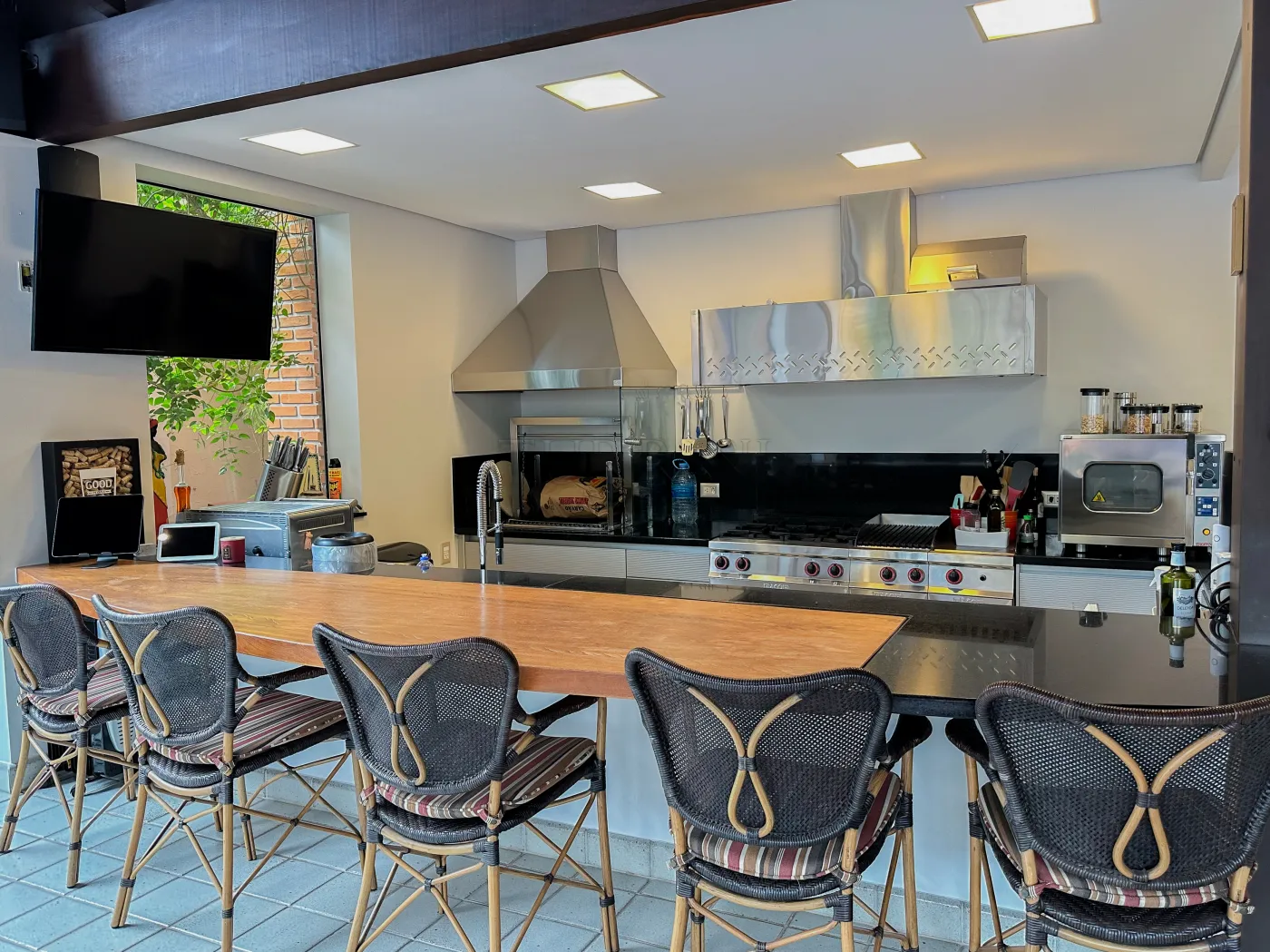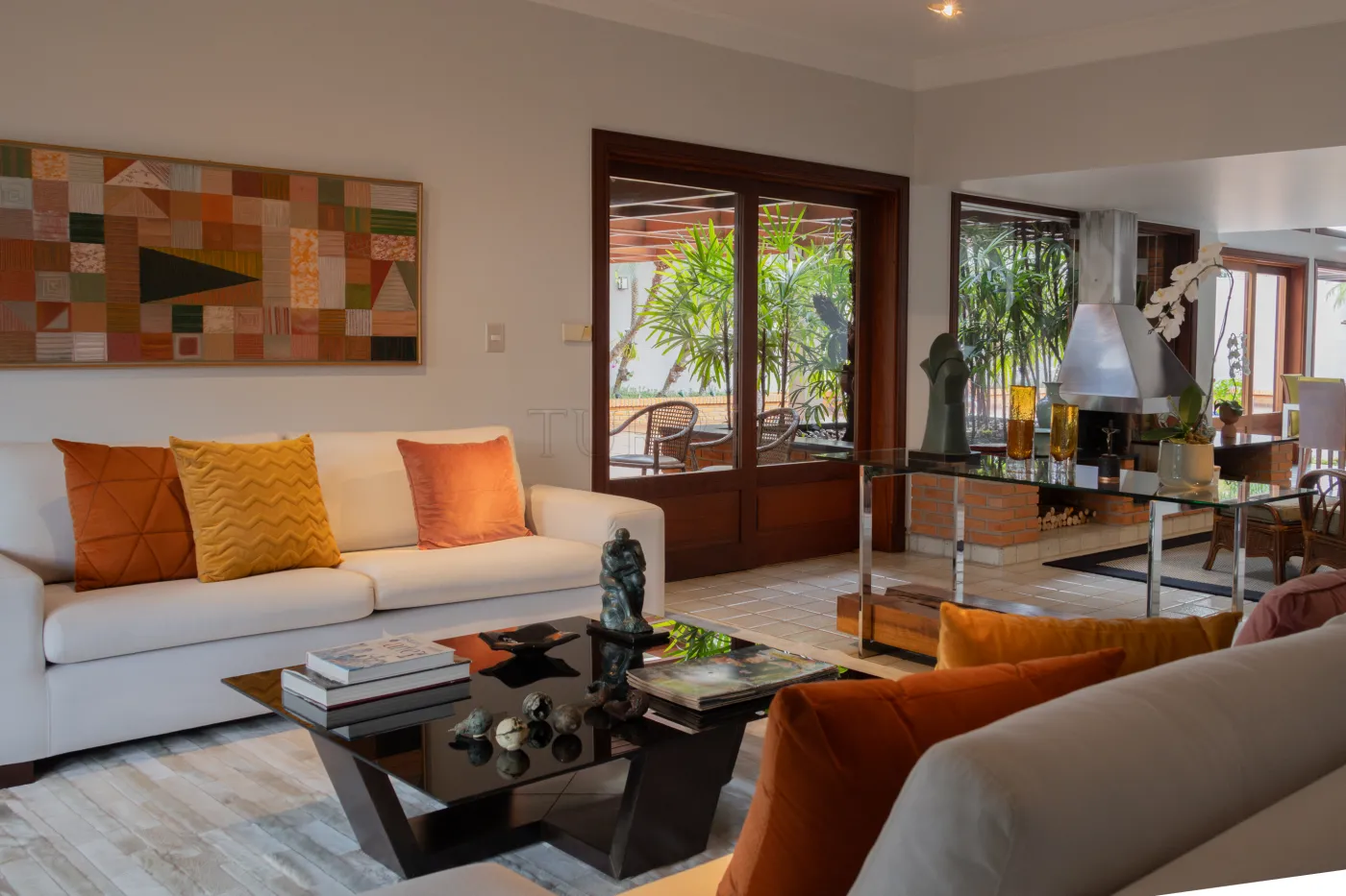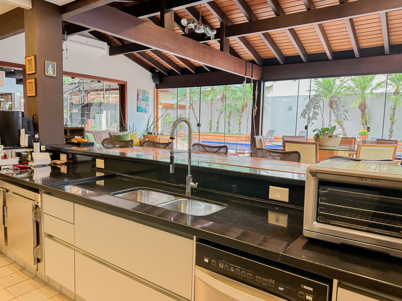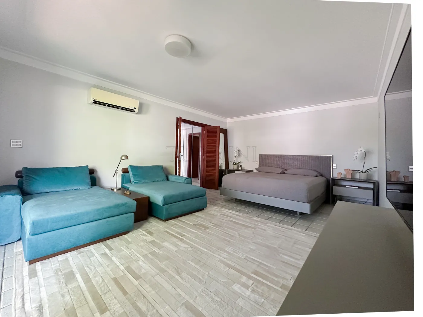 Na lateral da casa estão duas suítes para hóspedes, atendidas por uma copa, com acesso à sala de TV.