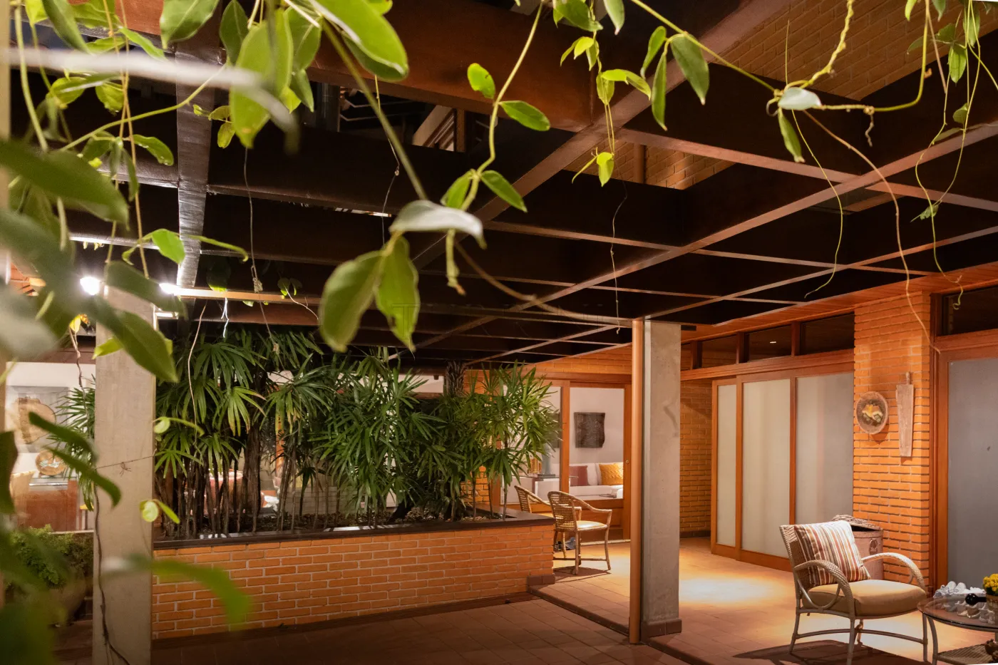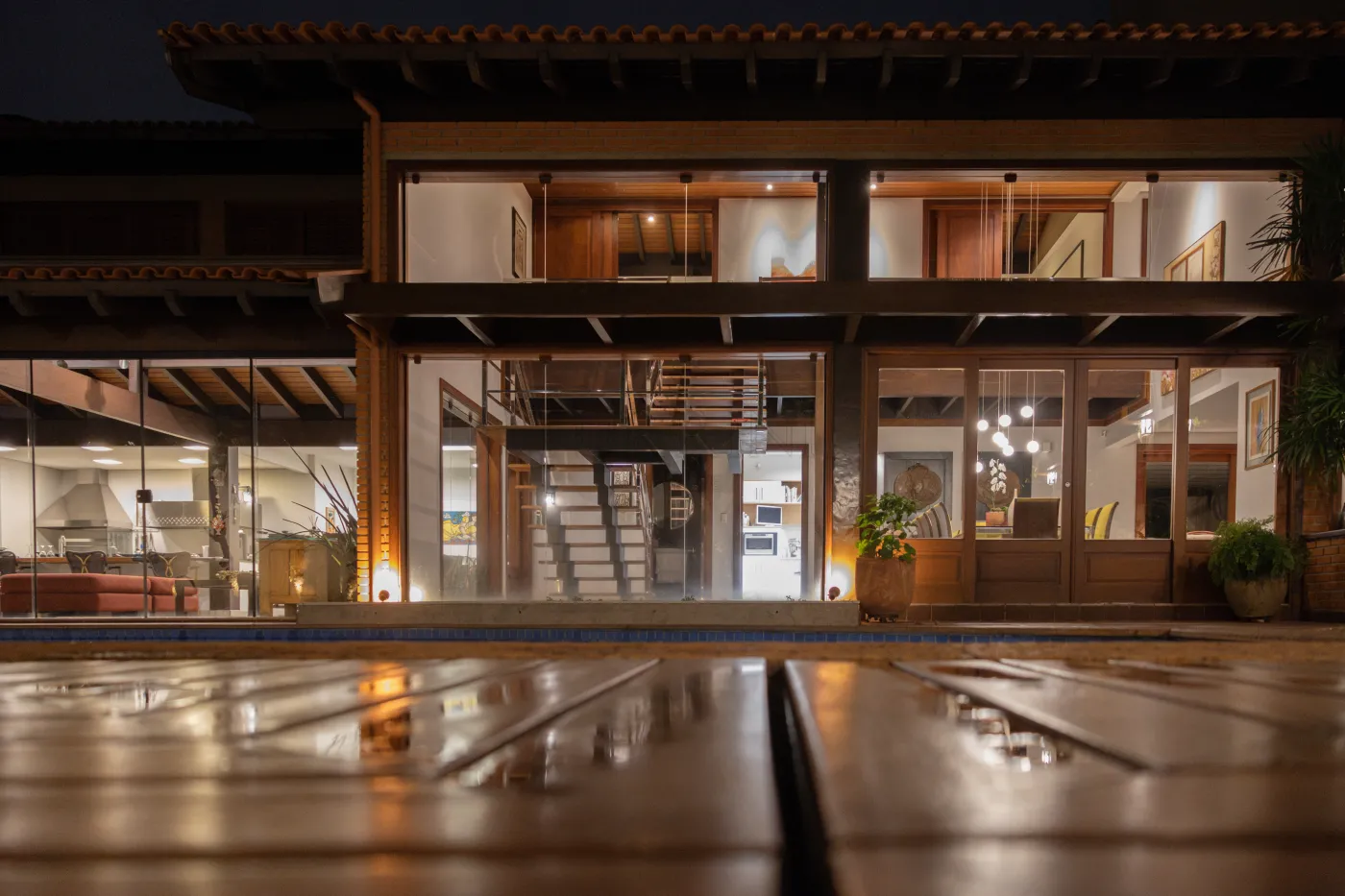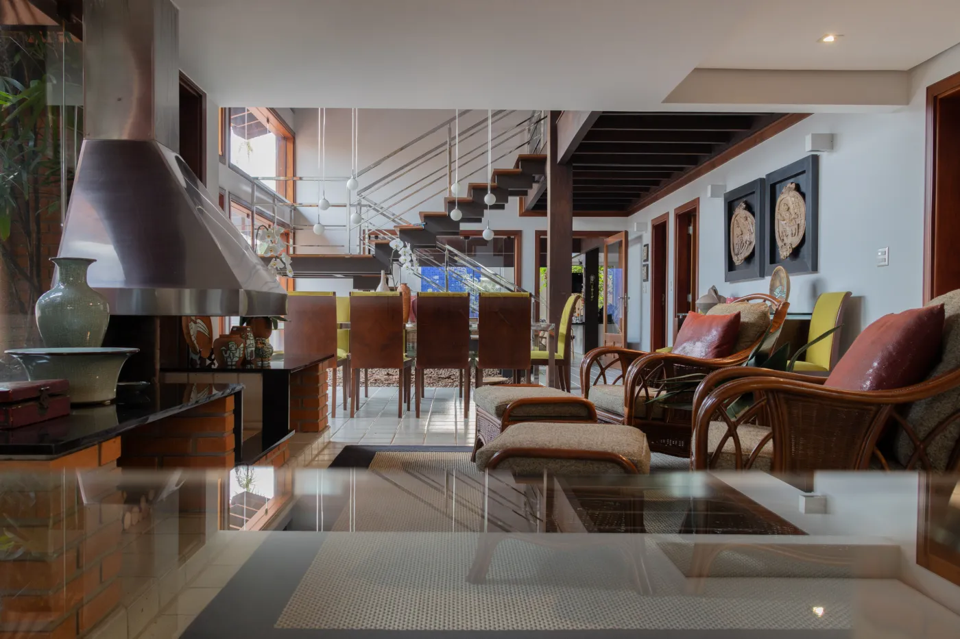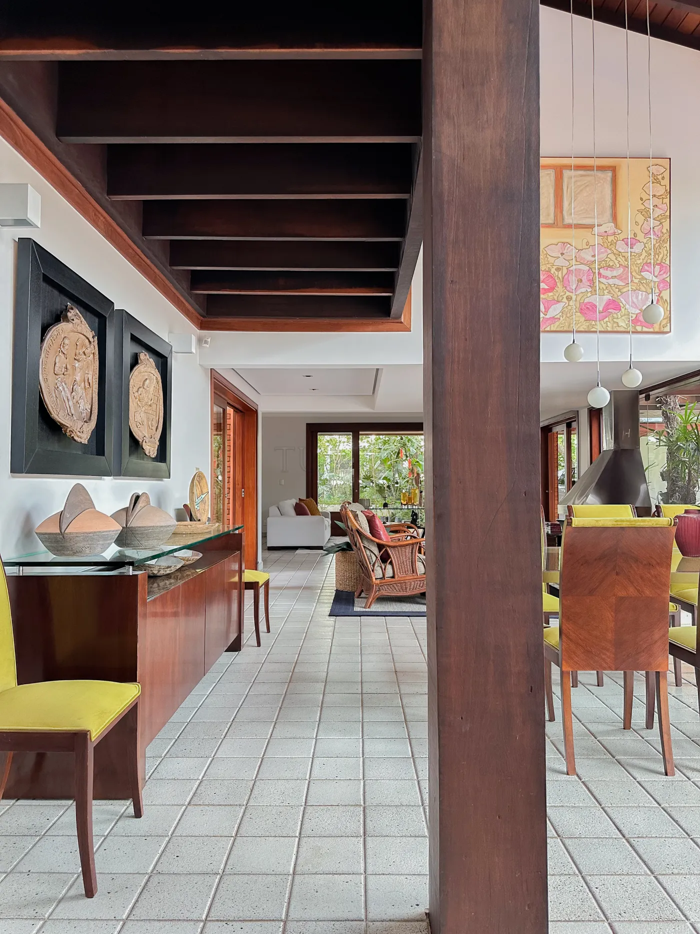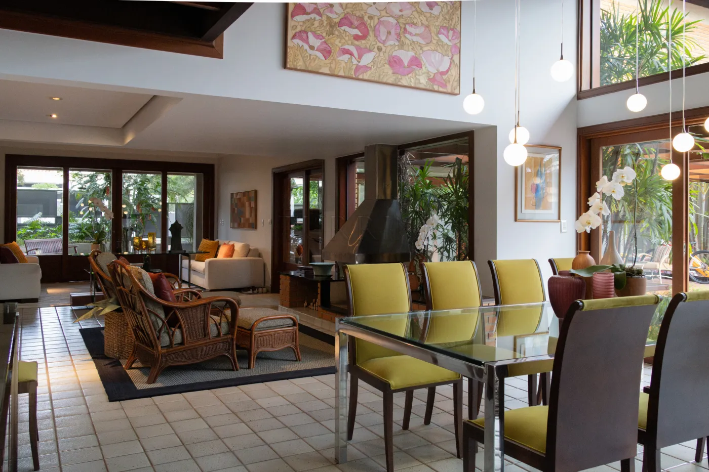 Estrutura leve, com grandes aberturas e superfície envidraçadas, emolduradas e sustentadas por madeiras nobres como jatobá e itaúba, reafirmam a essencialidade do projeto. Nada interrompe a sequência dos pisos artesanias do artista plástico Francisco Brennand, criando unidade e harmonia entre as áreas internas e externas.