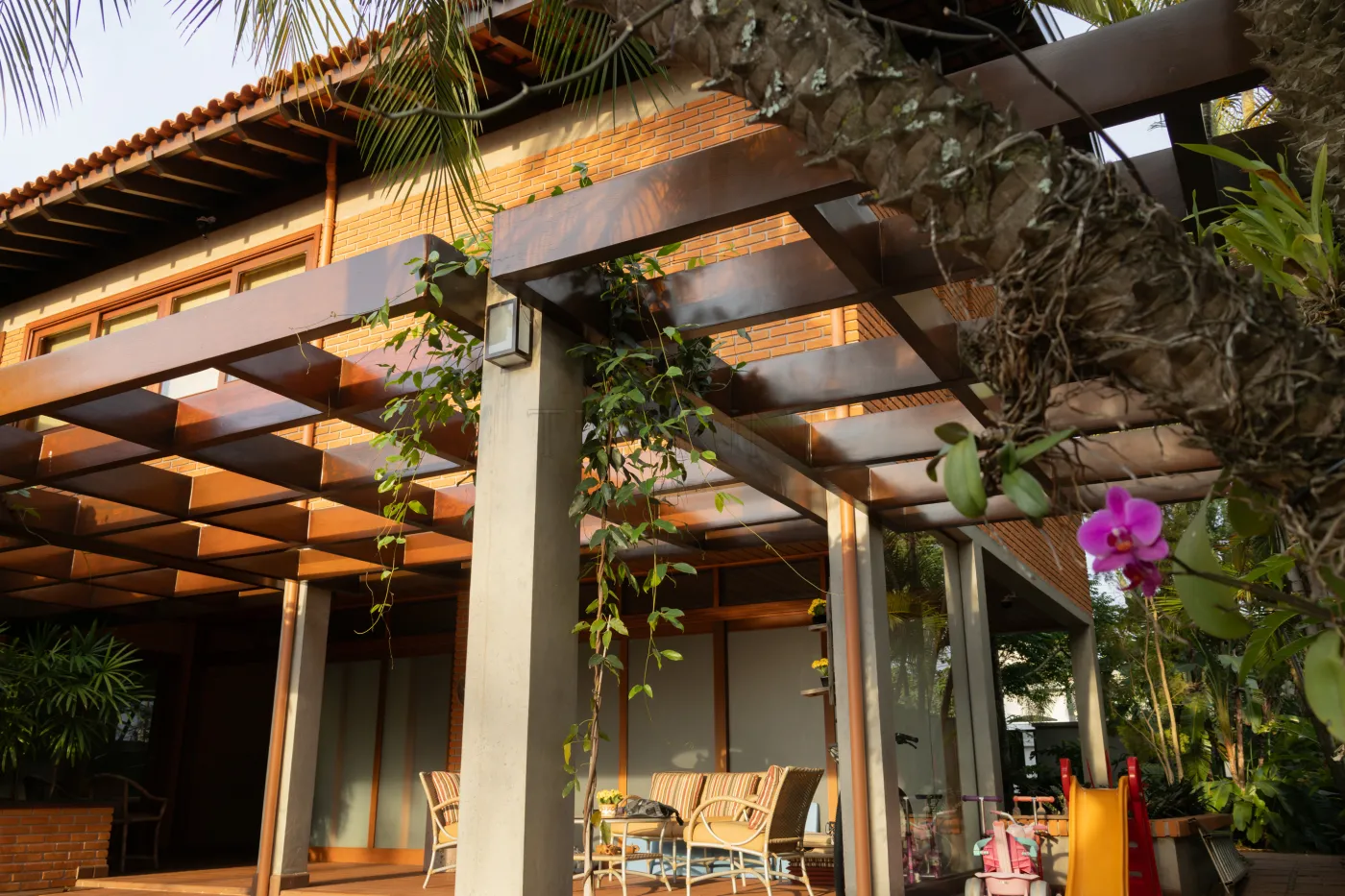 Dois volumes da casa são fortemente demarcados por uma vigorosa pérgola de madeira, que atravessa a casa e, do outro lado, ganha contornos de concreto aparente.