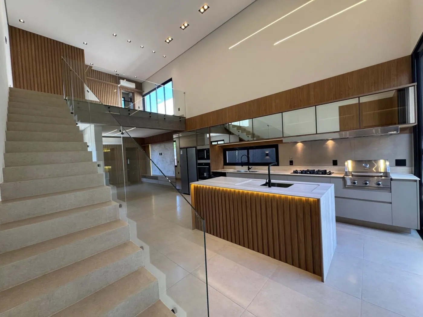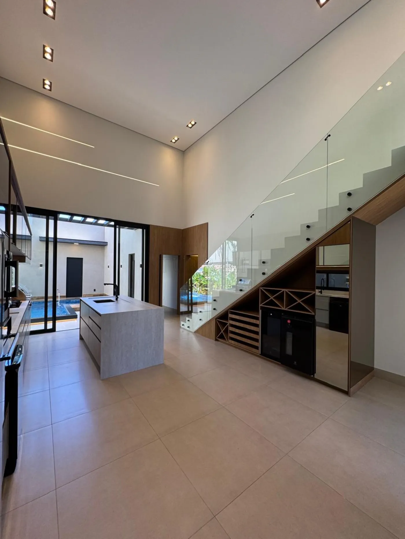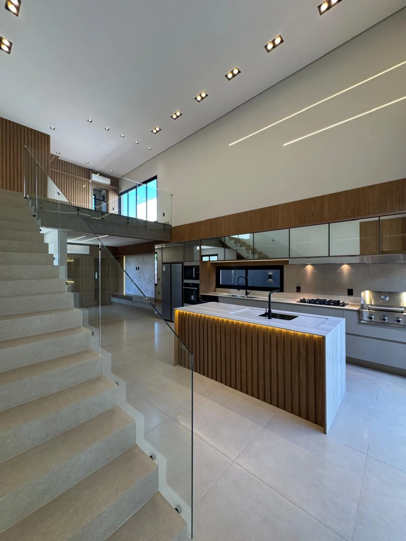living para três ambientes com pé direito duplo em um deles