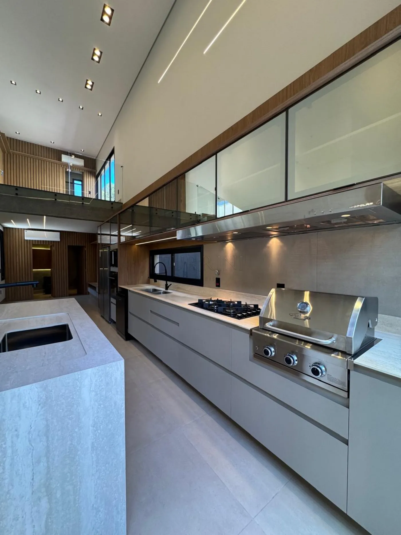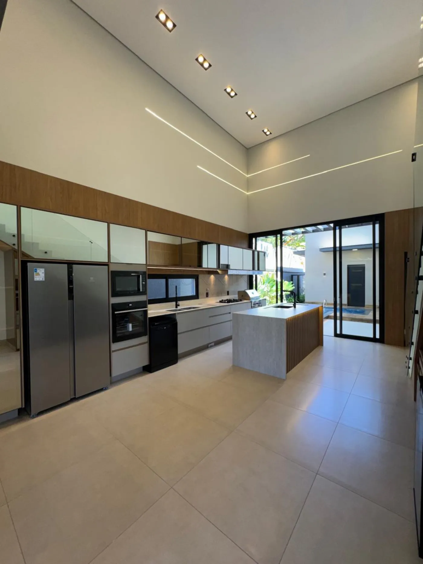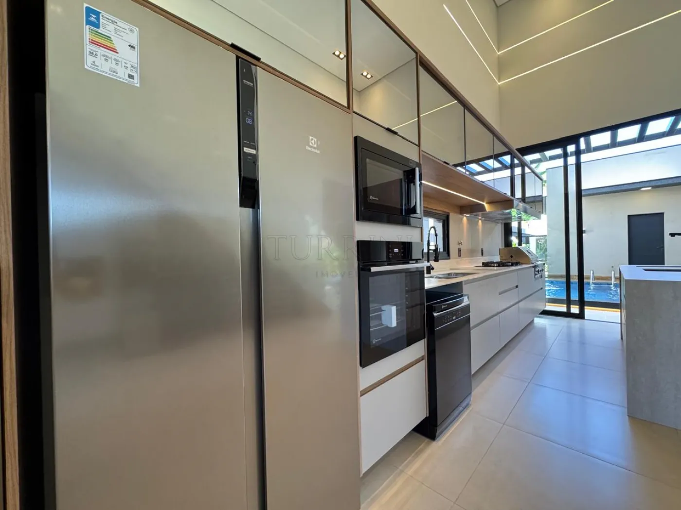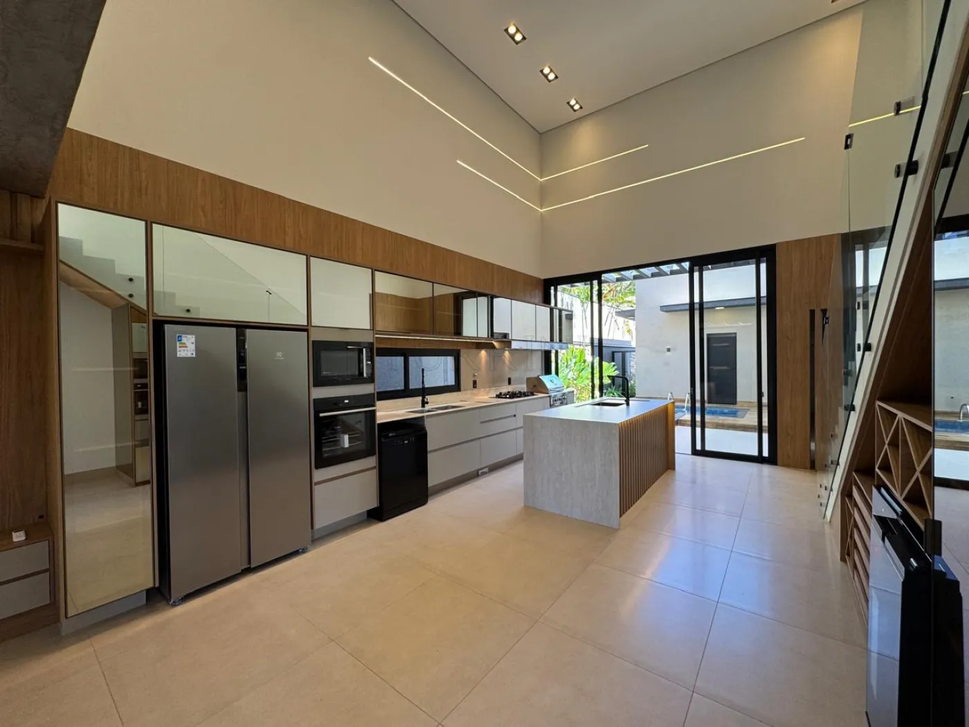 Cozinha planejada, dispensa, área gourmet completa com balcão refrigerado, com linda vista para a área de lazer