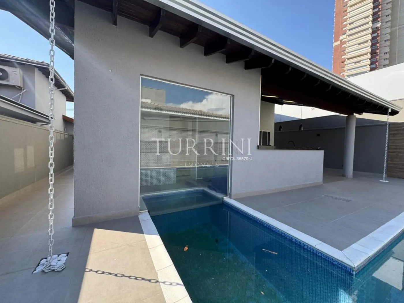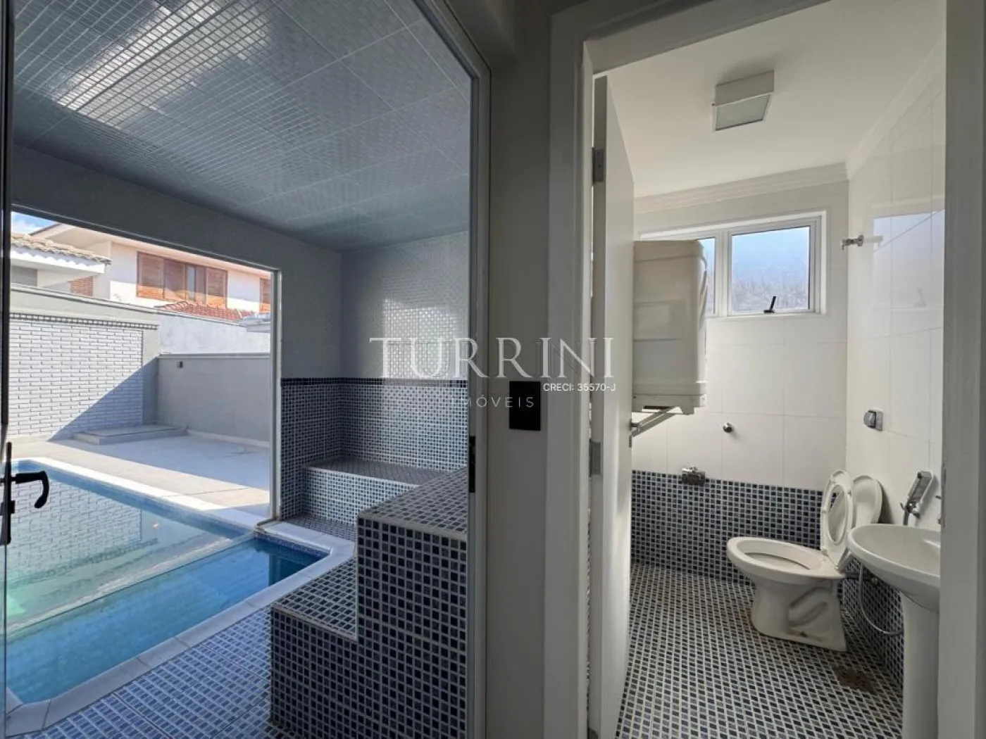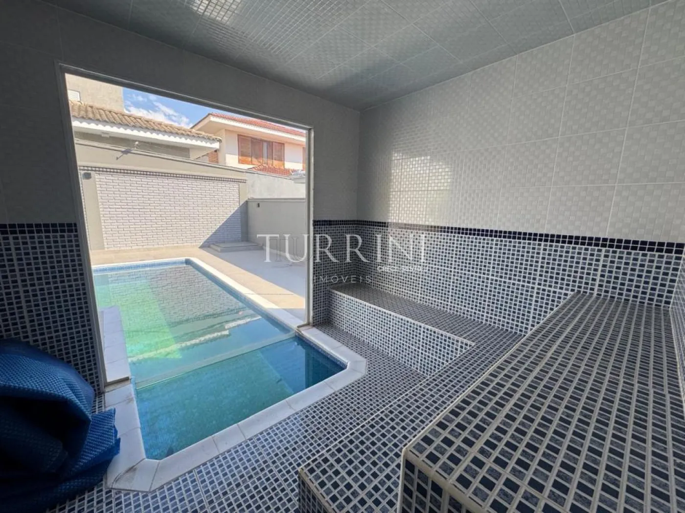 Sauna com vista para piscina.