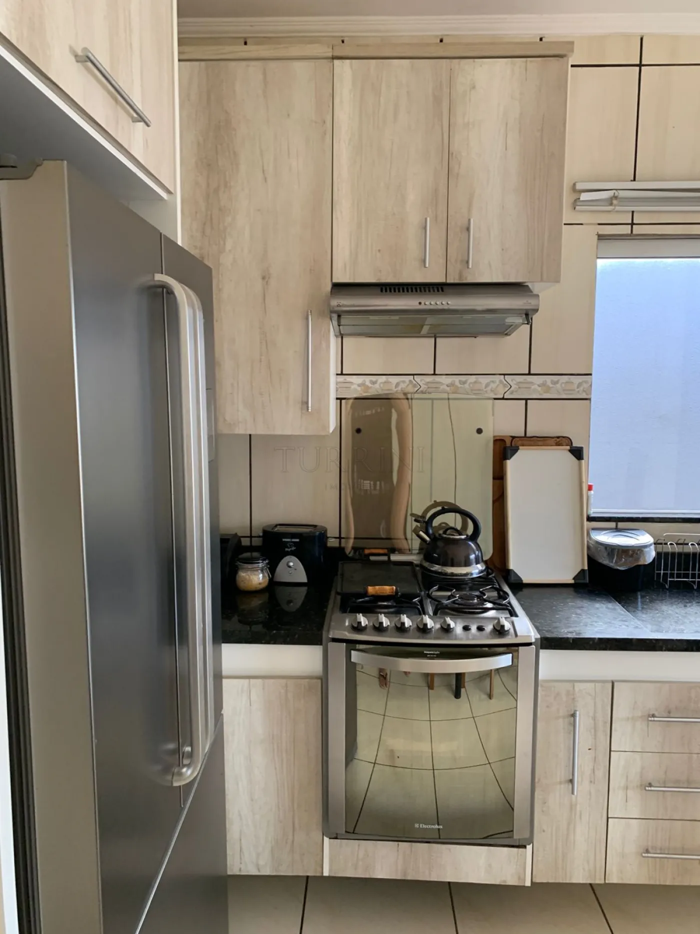 Cozinha com armários planejados, incluindo a mesa e pia de cozinha já com gabinete