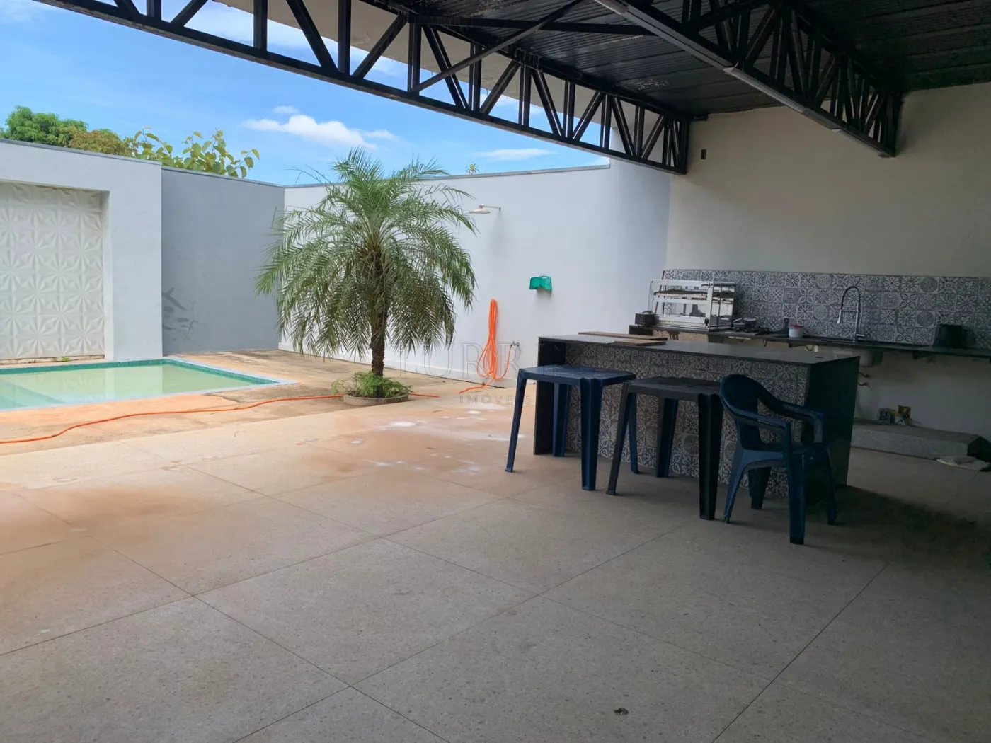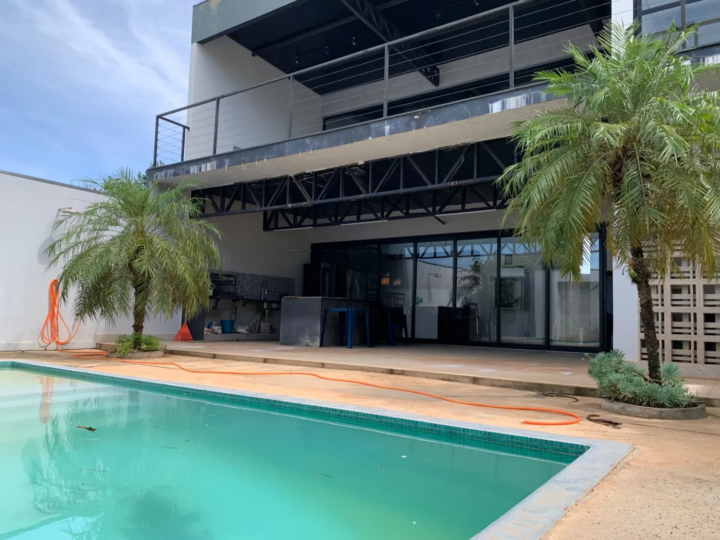 Ambiente open space cozinha, sala, área gourmet e piscina.