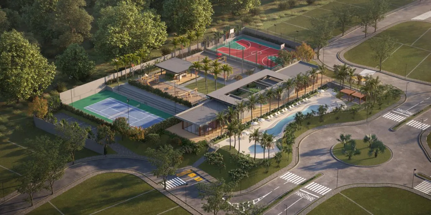 Área de lazer com piscina, quadras poliesportivas e gourmeteria