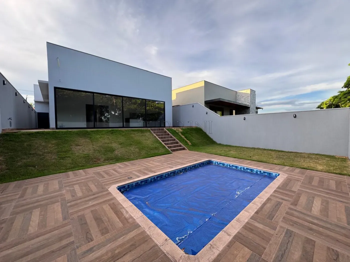 Piscina e armários na cozinha e banheiros.