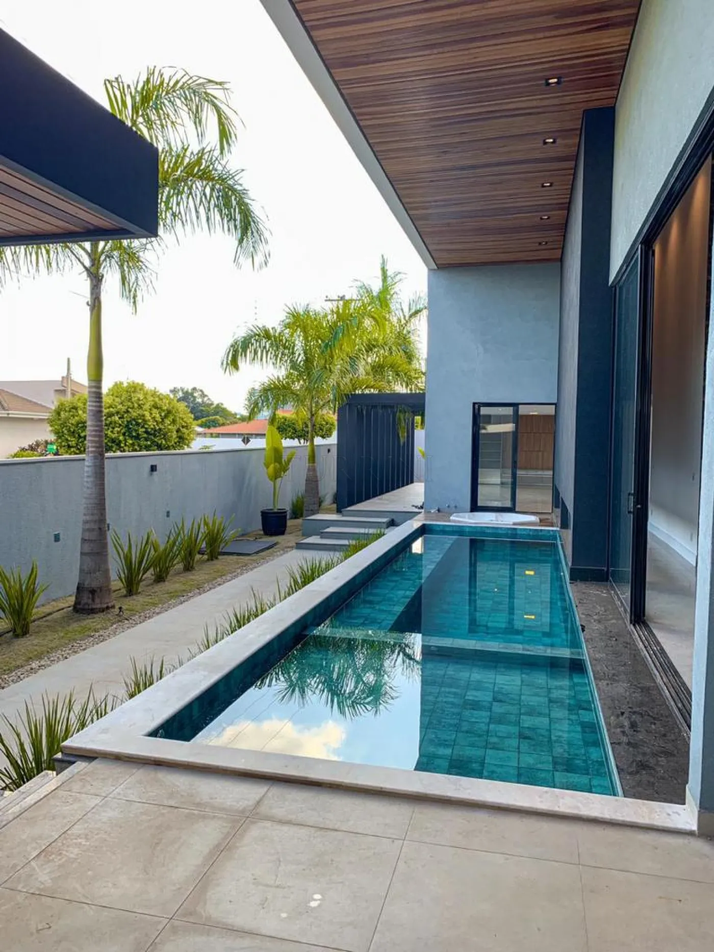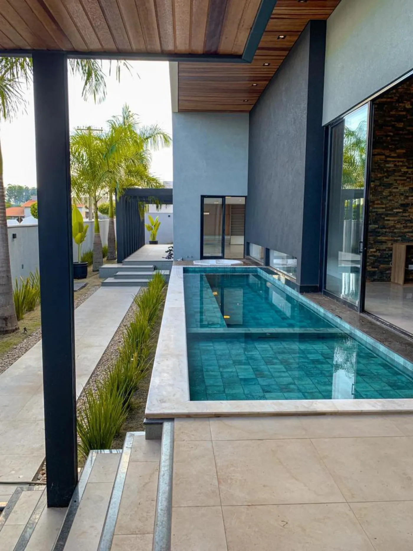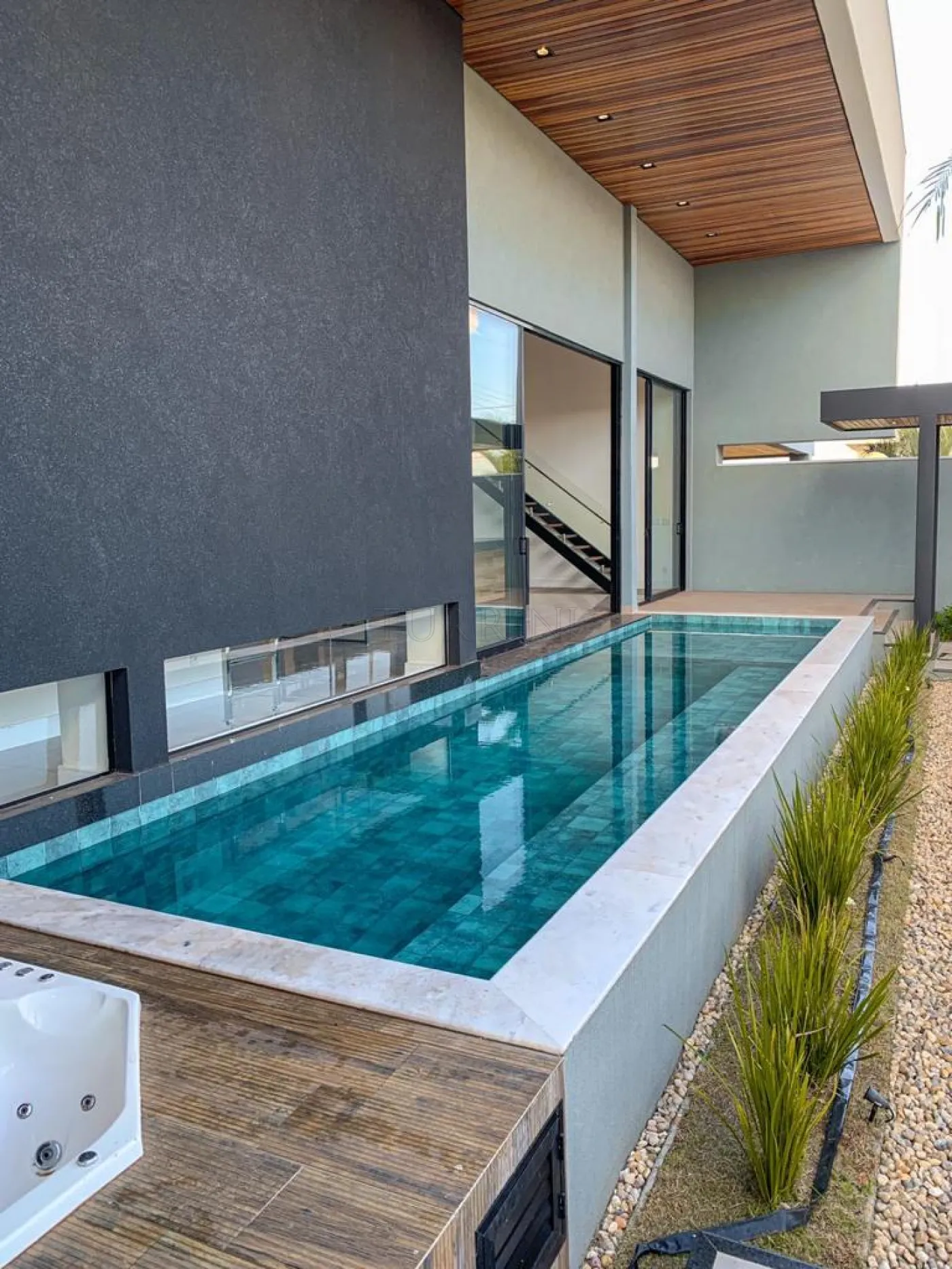 A piscina possui revestimento em pastilhas Portobello, prainha com hidromassagem, iluminação decorativa, sistema de aquecimento e tratamento de água por ozônio.
