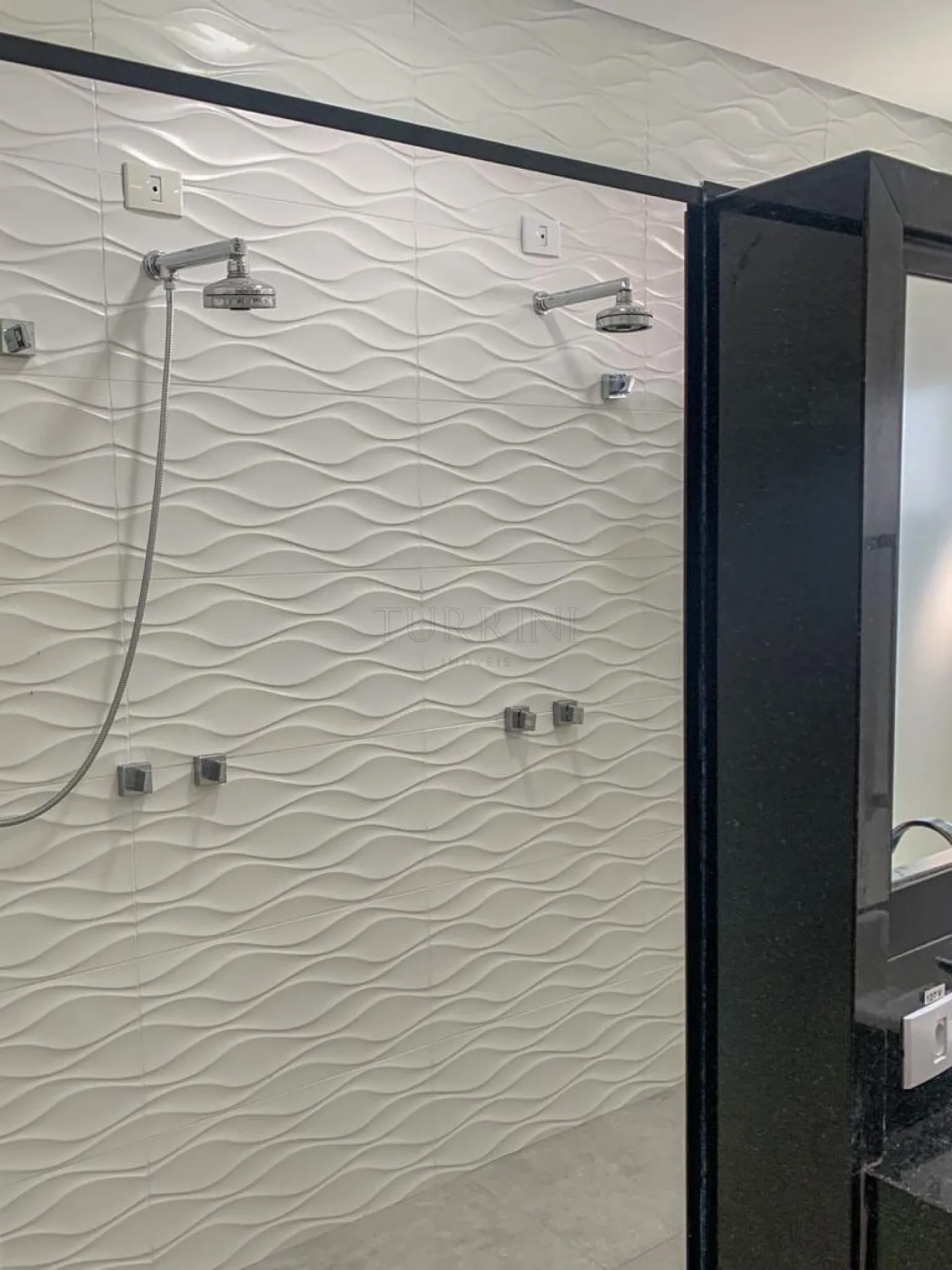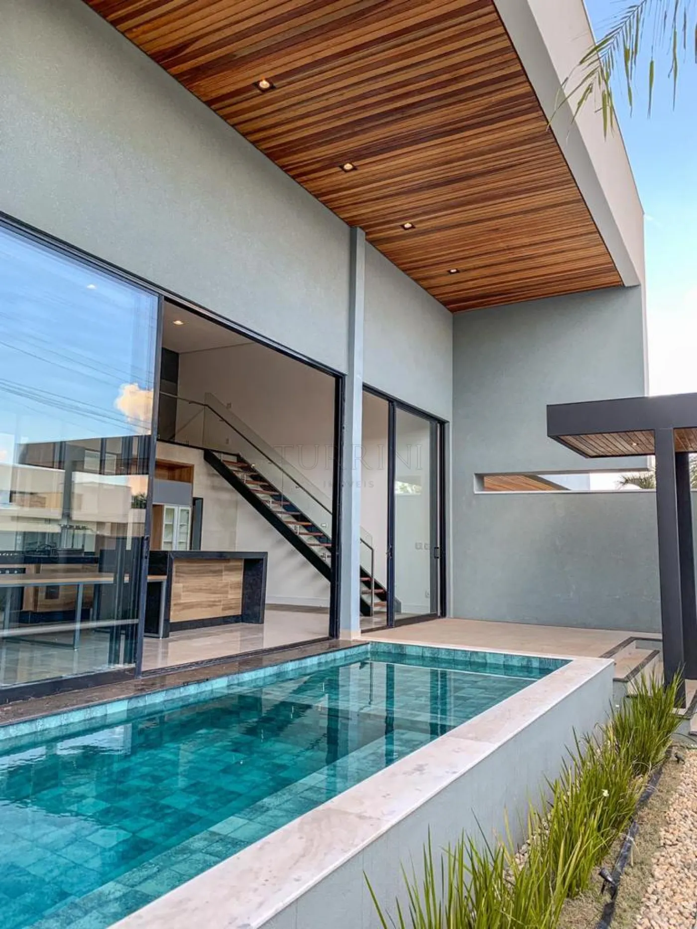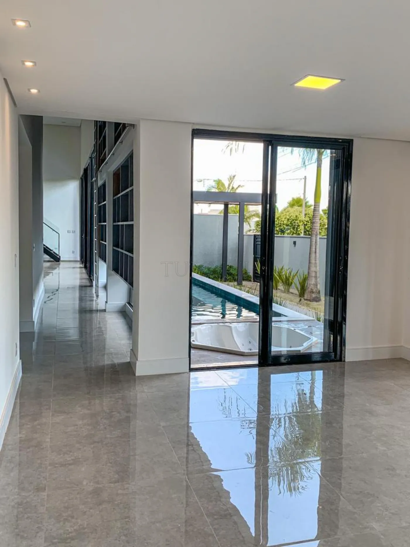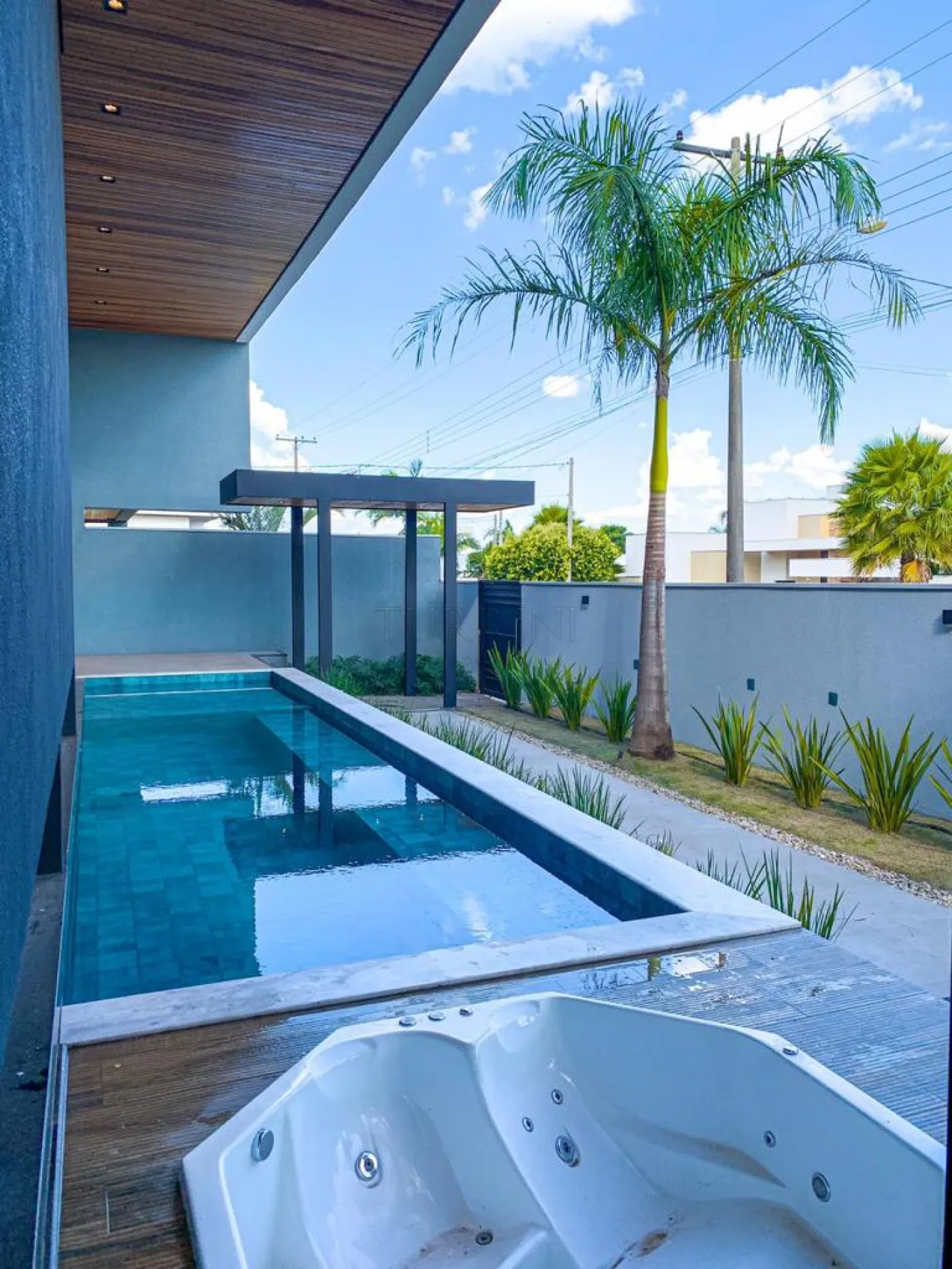 A piscina possui revestimento em pastilhas Portobello, prainha com hidromassagem, iluminação decorativa, sistema de aquecimento e tratamento de água por ozônio.